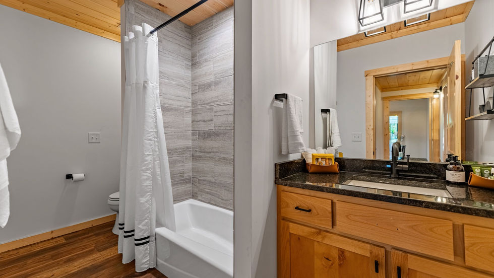 The third bathroom is located downstairs outside of the entertainment room and across from the third bedroom. It contains a combination shower and tub.